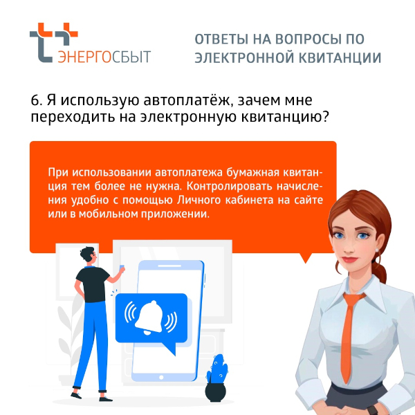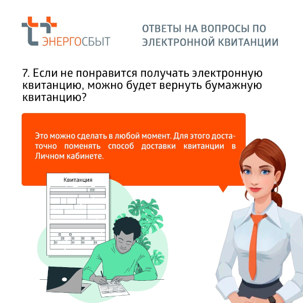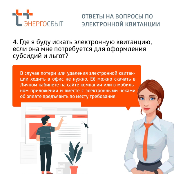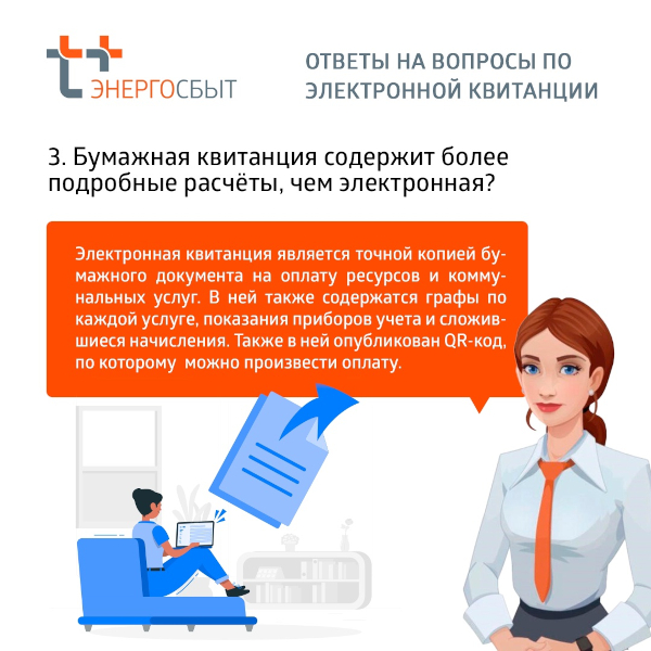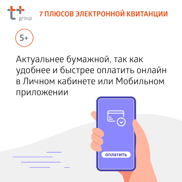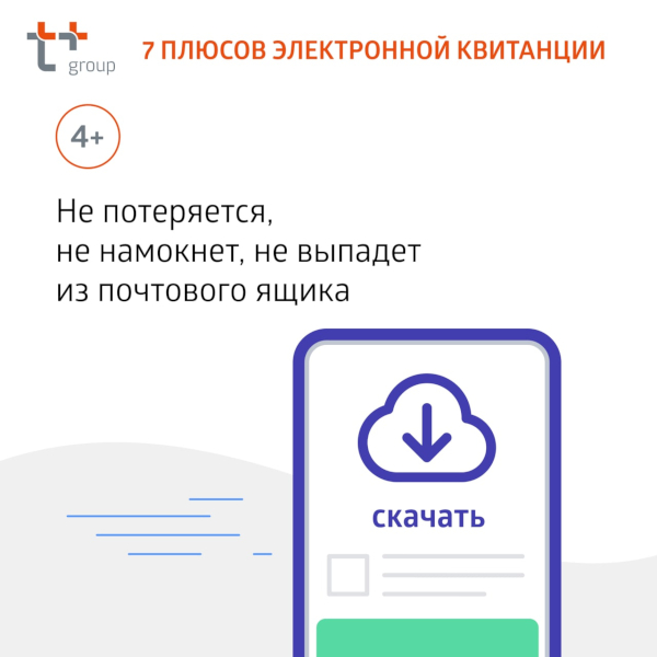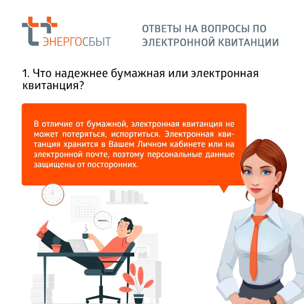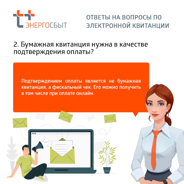 Электронная квитанция является аналогом бумажной квитанции. Она приходит раньше бумажной в личный кабинет или на электронную почту клиента. Электронный платежный документ не потеряется и не испортится.